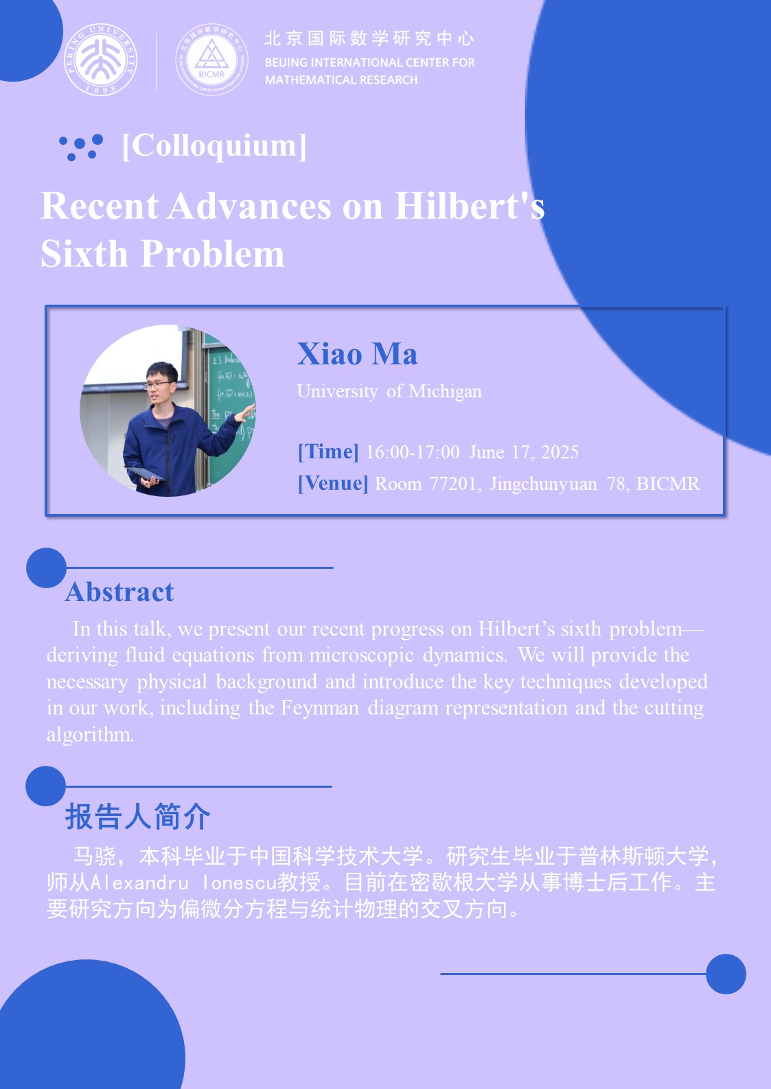 报告人简介:马骁,本科毕业于中国科学技术大学。研究生毕业于普林斯顿大学,师从Alexandru Ionescu教授。目前在密歇根大学从事博士后工作。主要研究方向为偏微分方程与统计物理的交叉方向。